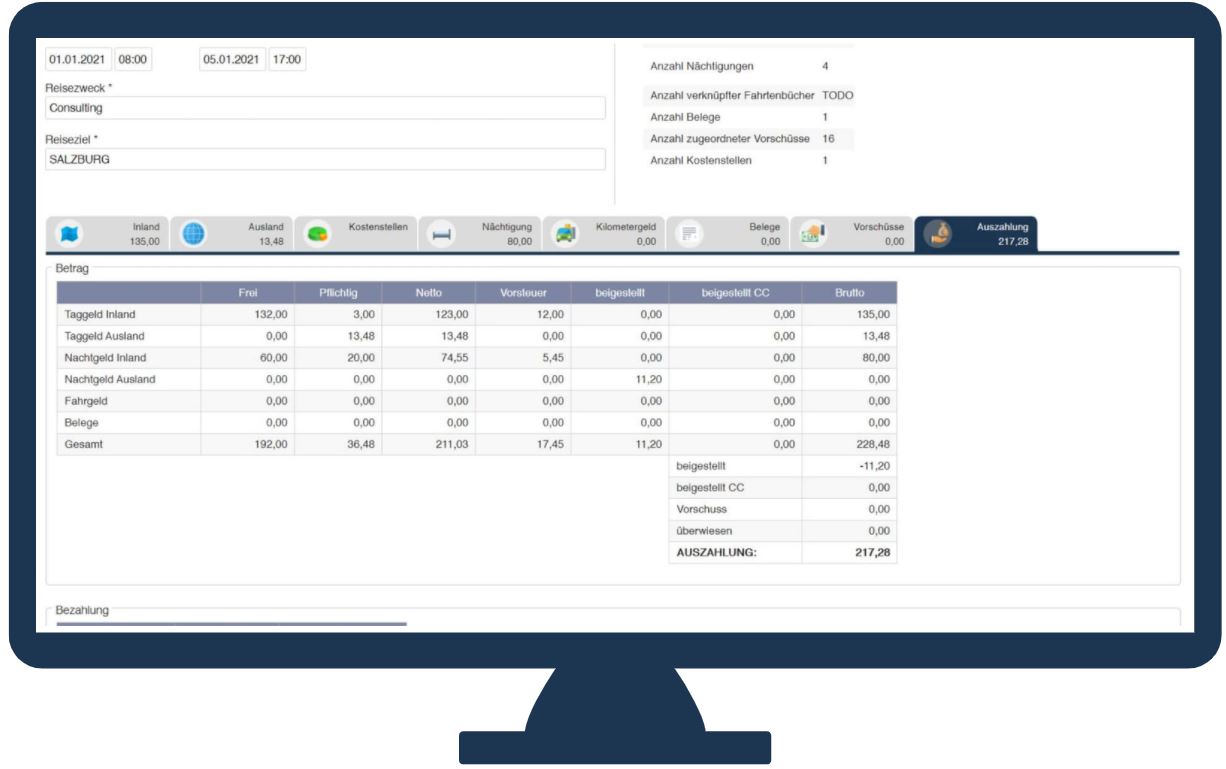 Individuelle Kriterien müssen nur einmal hinterlegt werden – danach erfolgen die unterschiedlichsten Berechnungen ganz automatisch und online! Hierbei können Kollektivverträge sowie Betriebs- und Einzelvereinbarungen flexibel abgebildet werden. Weiters sind Tages- und Nachtsätze für alle Länder verfügbar und werden auf Grundlage der Reisedauer ebenso automatisch ermittelt.